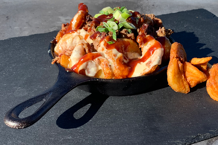 Cheese Sauce, BBQ Sauce, Green Onion, pulled pork or Brisket over sidewinder fries